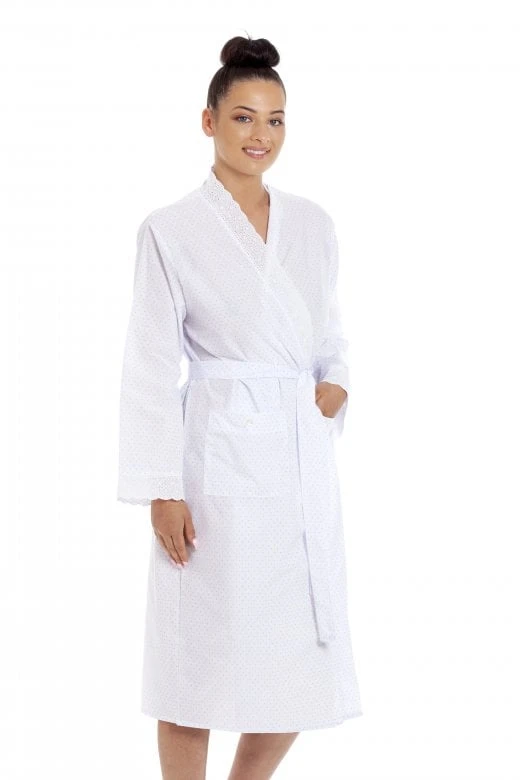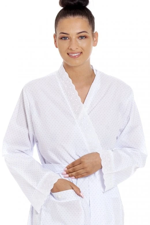Relax and unwind in the evening with this classic style polycotton dressing gown. The stylish polka dot design gives it an extra feminine feel. 3/4 length sleeves and lightweight material make it great for warm summer nights.