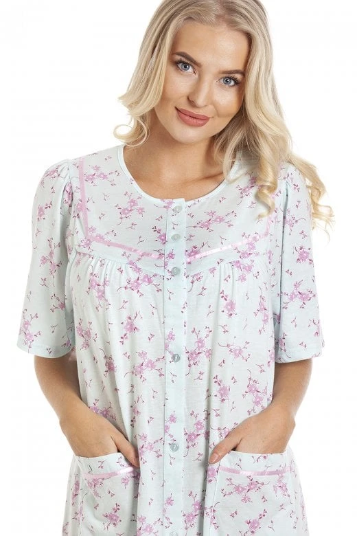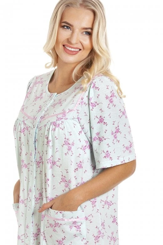 This lovely short sleeved button up nightdress is made from a lightweight poly/cotton blend. Featuring a beautiful floral design, neck line and cuffs, finished off with two side pockets. This nightdress is knee length and cling free making it perfect for the warmer nights.