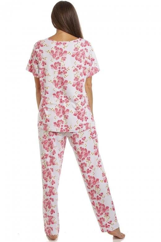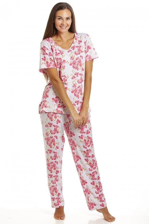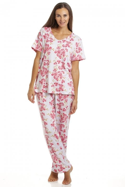 Our new full length floral pyjama set is a great addition to your spring-summer wardrobe. Featuring a stylish floral print in three different colour, short sleeves and an elasticated waist. This set is made from a polyester/spandex blend making this a loose fitting pyjama with added stretch if needed for extra comfort. This Pyjama is machine washable at 30° and washing dark colours separately.