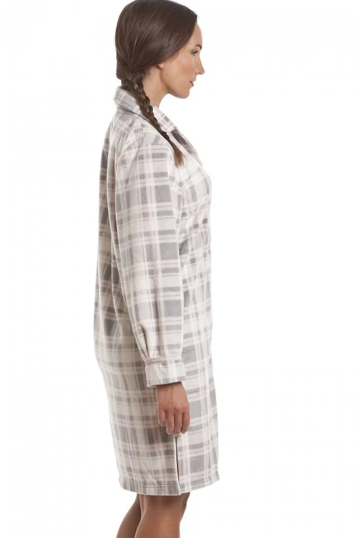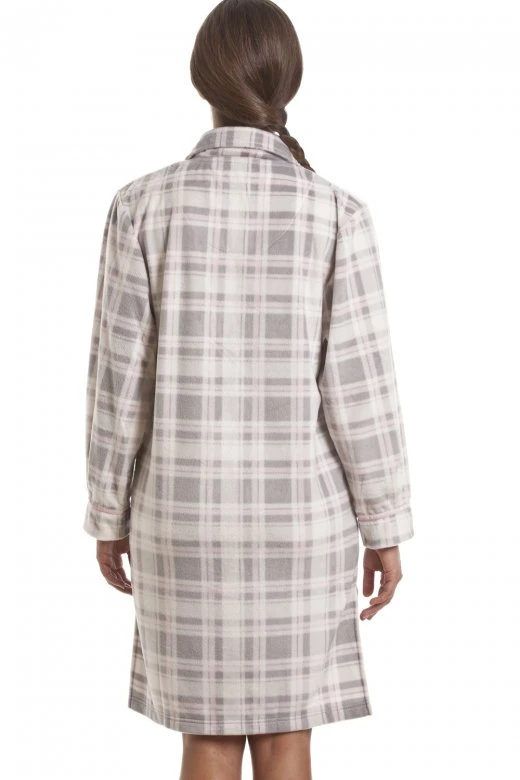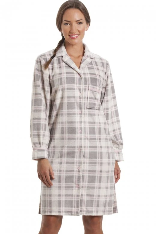 Supersoft fleece button front long sleeve nightdress. Features a fashionable Grey, Pink and White checkered design.