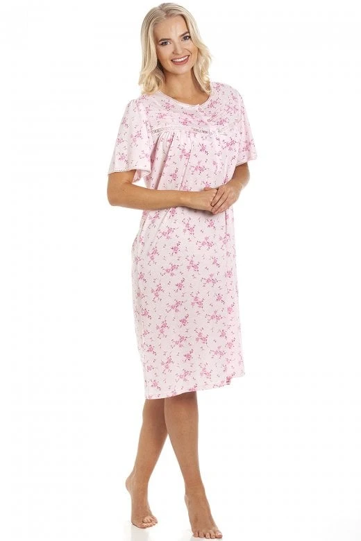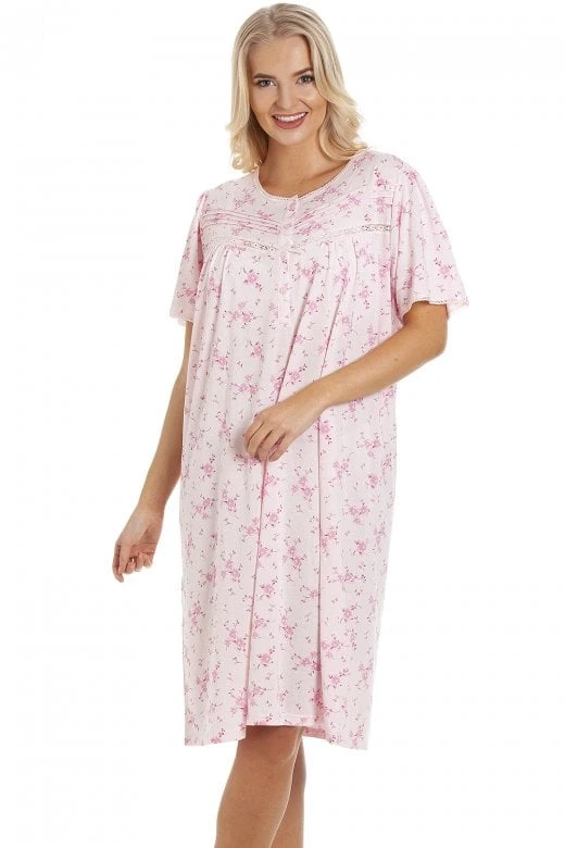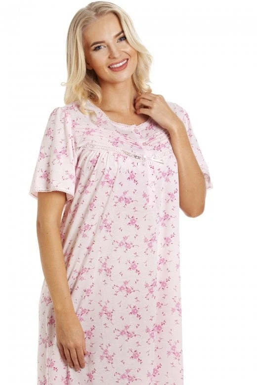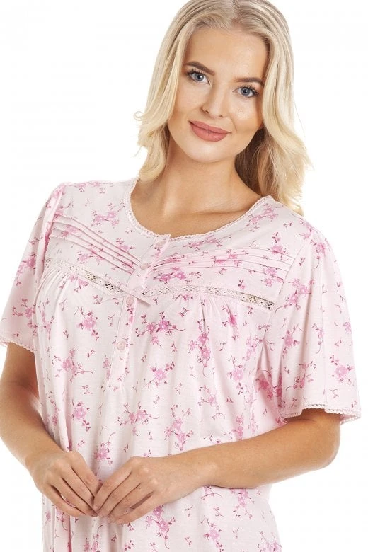 This lovely short sleeved four button up nightdress is made from a lightweight poly/cotton blend. Featuring a beautiful floral design and a delicate lace trim across the chest, neck line and cuffs, finished off with a small bow at the center of the chest. This nightdress is knee length and cling free making it perfect for the warmer nights.