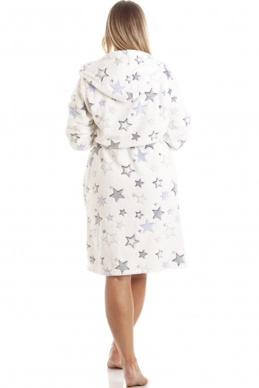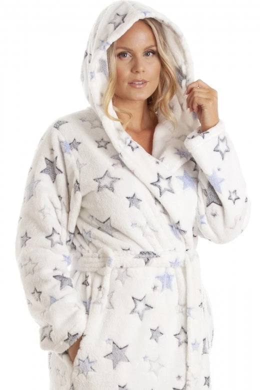 Relax and unwind in this comfortable modern Bathrobe. The stylish star print design gives the robe an extra feminine feel.
